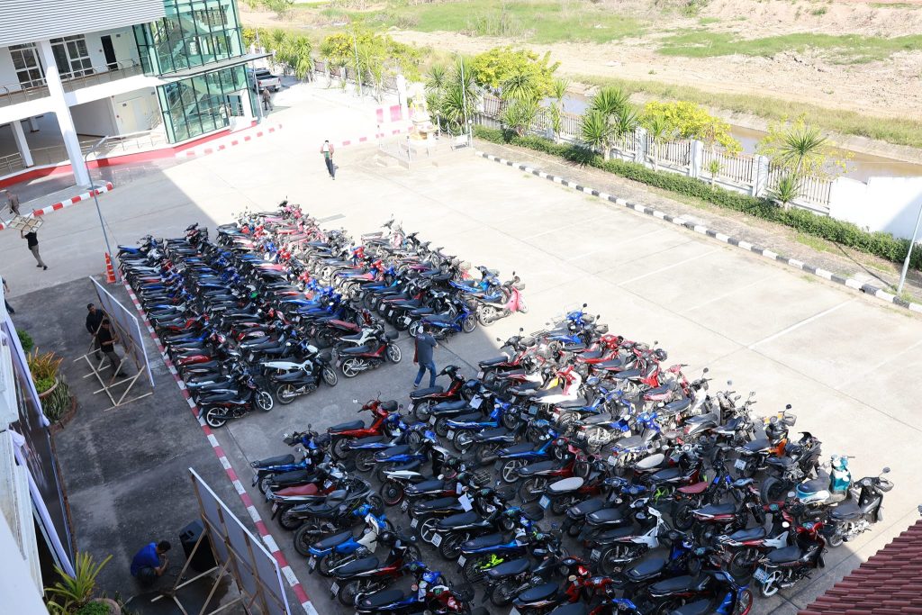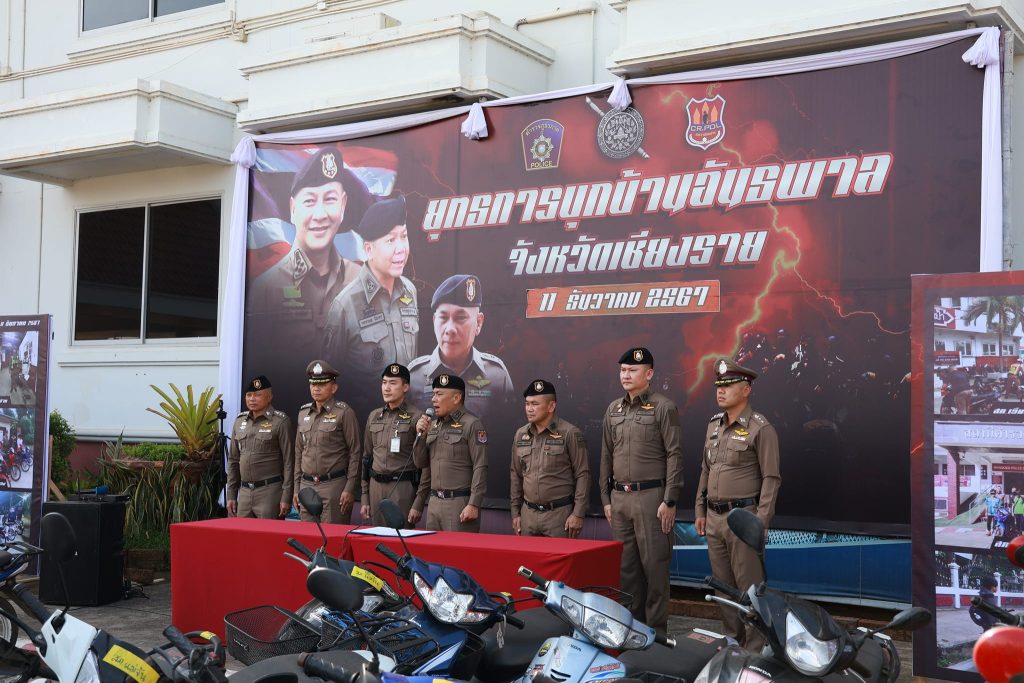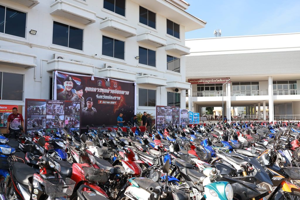โดยมีของกลางเป็นรถจักรยานยนต์ดัดแปลงสภาพที่ตรวจยึดทั้งหมดจำนวน 506 คัน สำหรับของกลางที่นำมาแถลงข่าวในวันนี้ประกอบไปด้วย รถจักรยานยนต์ดัดแปลงสภาพ จำนวน 270 คัน เป็นของกลางจาก สภ. เมืองเชียงราย จำนวน 80 คัน, สภ. แม่จัน จำนวน 50 คัน, สภ. บ้านดู่ จำนวน 50 คัน, สภ. แม่ยาว จำนวน 30 คัน, สภ. เวียงชัย จำนวน 30 คัน และ สภ. แม่ลาว จำนวน 30 คัน